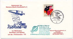 Bundesrepublik - Unterlüß 5.9.1970 - Versuchsreihen 8/70 und 9/70 der Hermann-Oberth-Gesellschaft anläßlich zur Ehrung von Dipl.-Ing. Rudolf Nebel und zum 40-jährigen Bestehen des Raketenflugplatzes Berlin. Satz bestehend aus einer Postkarte und einem Umschlag der beiden Raketenstarts mit Sonderstempeln und Zudrucken, echt geflogen. EZ: 96C1, 96C2Fixed Price